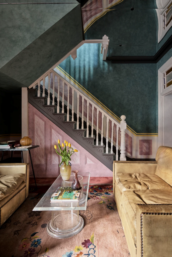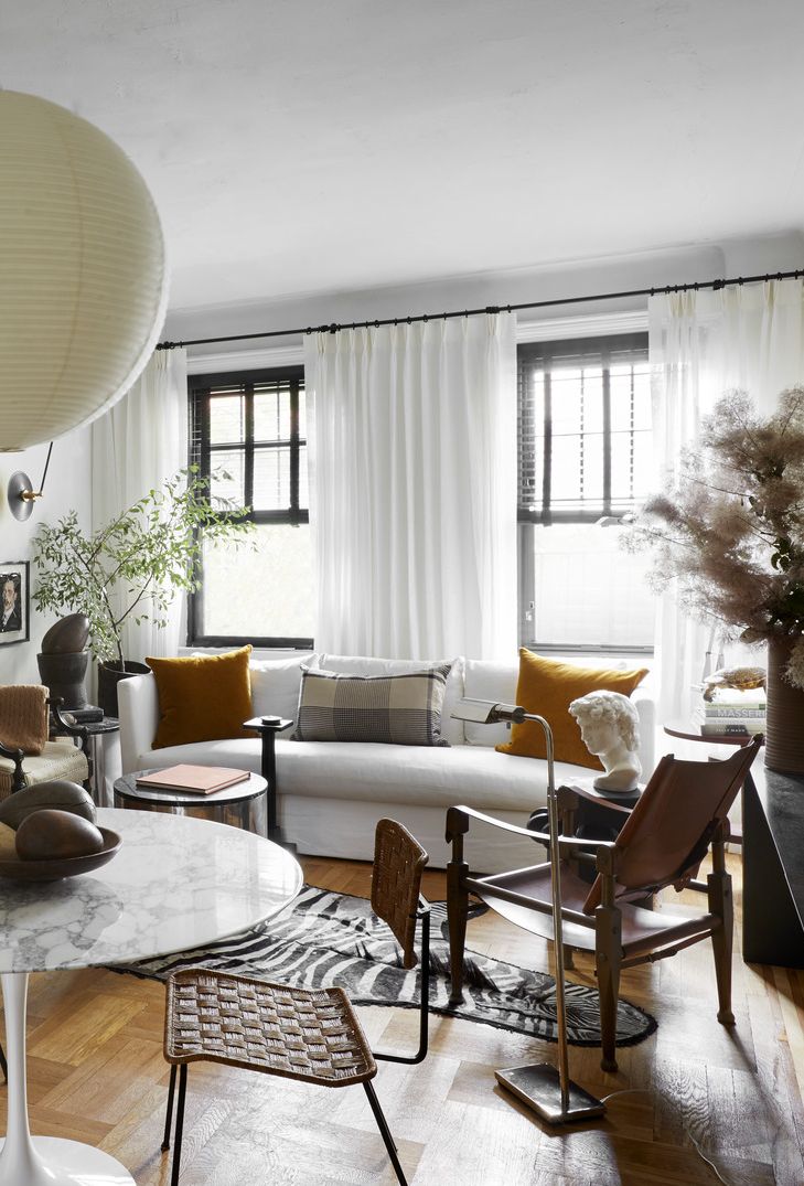 Nếu bạn cảm thấy bế tắc và chán nản, một tấm thảm trải khắp phòng hoặc một tác phẩm nghệ thuật có thể là điểm khởi đầu tuyệt vời cho phần còn lại của bảng màu. Mọi thứ trong phòng khách nhỏ này đều được lấy cảm hứng từ tấm thảm Art Deco tuyệt đẹp, từ lớp sơn màu thạch cao cho đến những chiếc ghế sofa da nam tính. Một chiếc bàn lucite giữ góc nhìn thấp hơn khi nhìn lên trần nhà được tráng gương.
