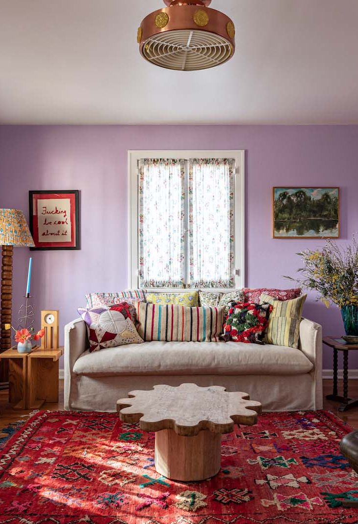 Trong phòng khách kiểu bungalow nhỏ này , chiếc ghế dài bọc vải lanh hiện đại được trang trí theo phong cách bohemian được bao quanh bởi sự kết hợp giữa các điểm nhấn sang trọng kiểu già dặn và các chi tiết của thập niên 70. Một sắc tím tạo sự ngờ hoă quyện với sự trẻ hóa giúp mọi thứ luôn tươi mới và thú vị.