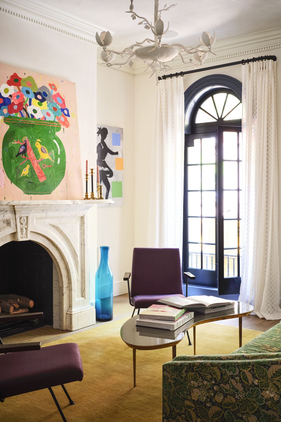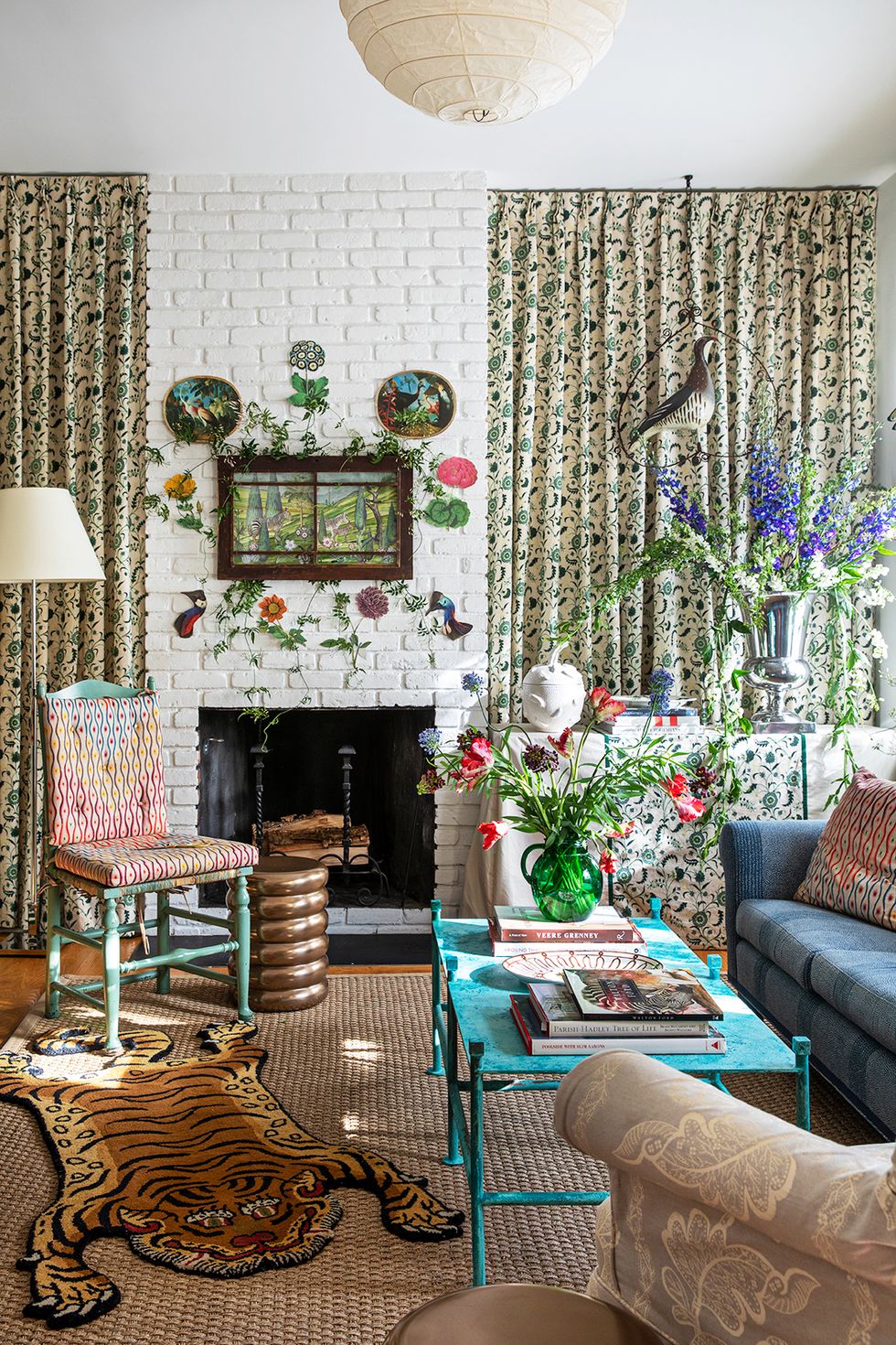 Đôi khi không gian nhỏ hơn thực sự cho phép thử màu sắc và hoa văn táo bạo hơn. Như căn phòng này, người đã sử dụng họa tiết hoa tương tự cho ghế sofa và rèm, các họa tiết báo gêpa tương ứng (và hoang dã hơn!) trên thảm và gối ném, sau đó kết hợp màu sơn xanh lá cây mùa xuân với chiếc ghế dài có sọc. Nếu bạn yêu thích kiểu dáng này nhưng lại thích thứ gì đó hiện đại hơn, hãy thử công thức này nhưng sau đó thay đổi các bản in truyền thống bằng những bức ảnh hiện đại, sắc sảo hoặc một bức tranh trừu tượng.