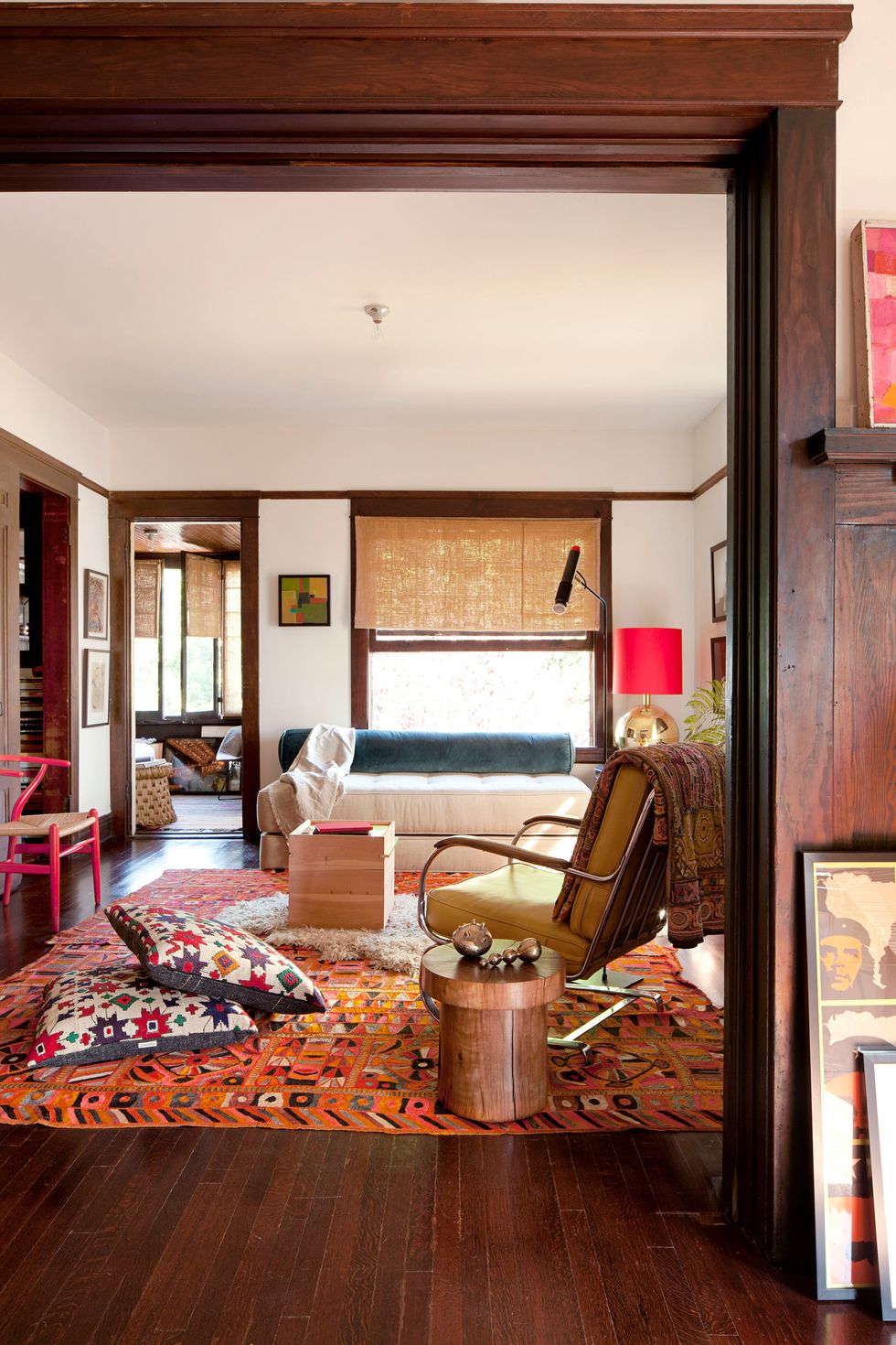 Trong một phòng khách theo phong cách bohemian, hầu như mọi thứ đều có thể sử dụng được — nhưng nếu bạn cần một số hướng dẫn, hãy thử áp dụng công thức này: giường sofa cộng với ghế phụ, ghế bành, gối sàn và một vài chiếc ghế đẩu. Trong trường hợp này.