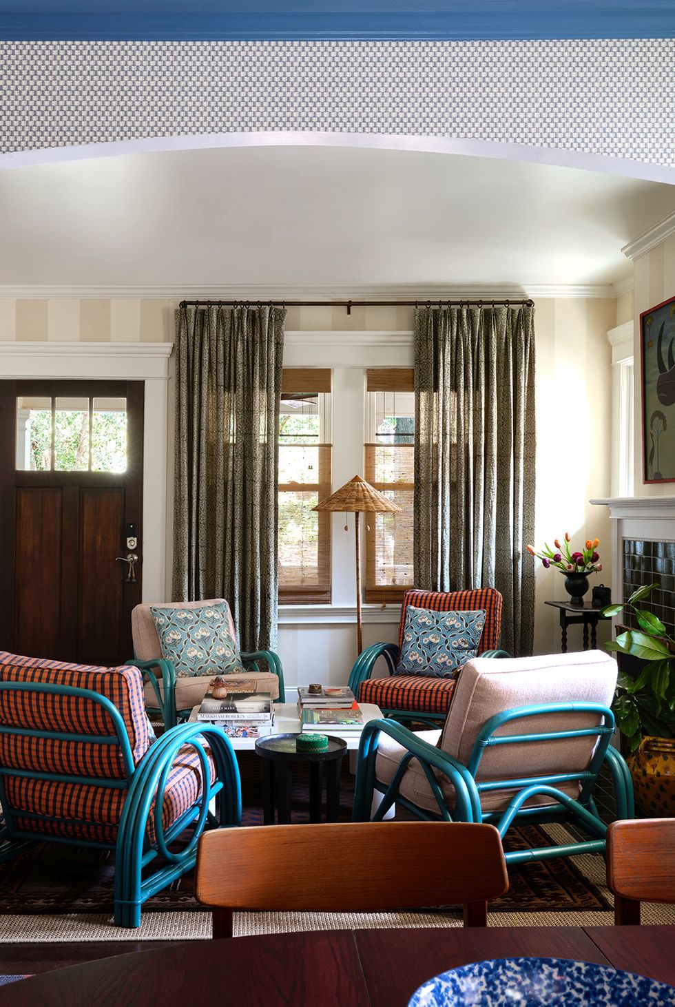 Bỏ hoàn toàn ghế sofa nếu bạn muốn sử dụng phòng khách làm nơi trò chuyện và trò chuyện với người khác thay vì nằm dài theo chiều ngang. Bốn chiếc ghế mây sơn màu xanh hướng về nhau để thăm viếng, nhưng chúng đủ thoải mái để ngả lưng và ngả lưng trong những khoảnh khắc yên tĩnh hơn trong cuộc sống trong phòng khách nhỏ và tràn đầy tiếng cười.