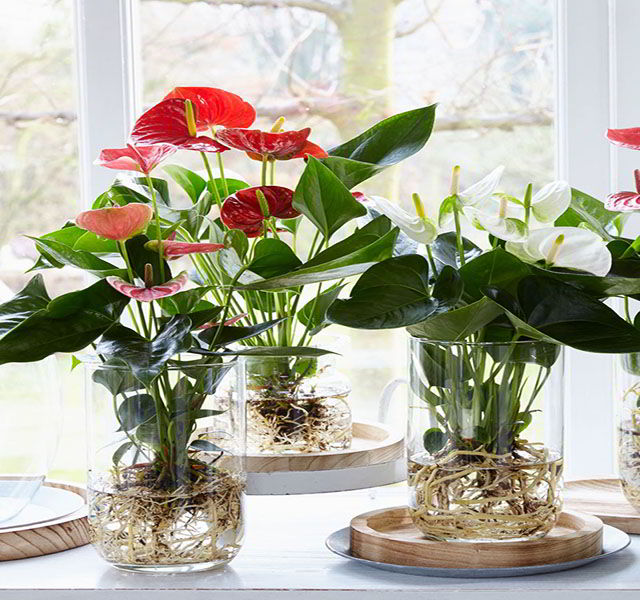 Cây hồng môn nổi bật với những chiếc lá xanh bóng mượt và những bông hoa hình trái tim màu đỏ, hồng hoặc trắng, tạo nên một điểm nhấn thu hút ánh nhìn trong không gian sống.