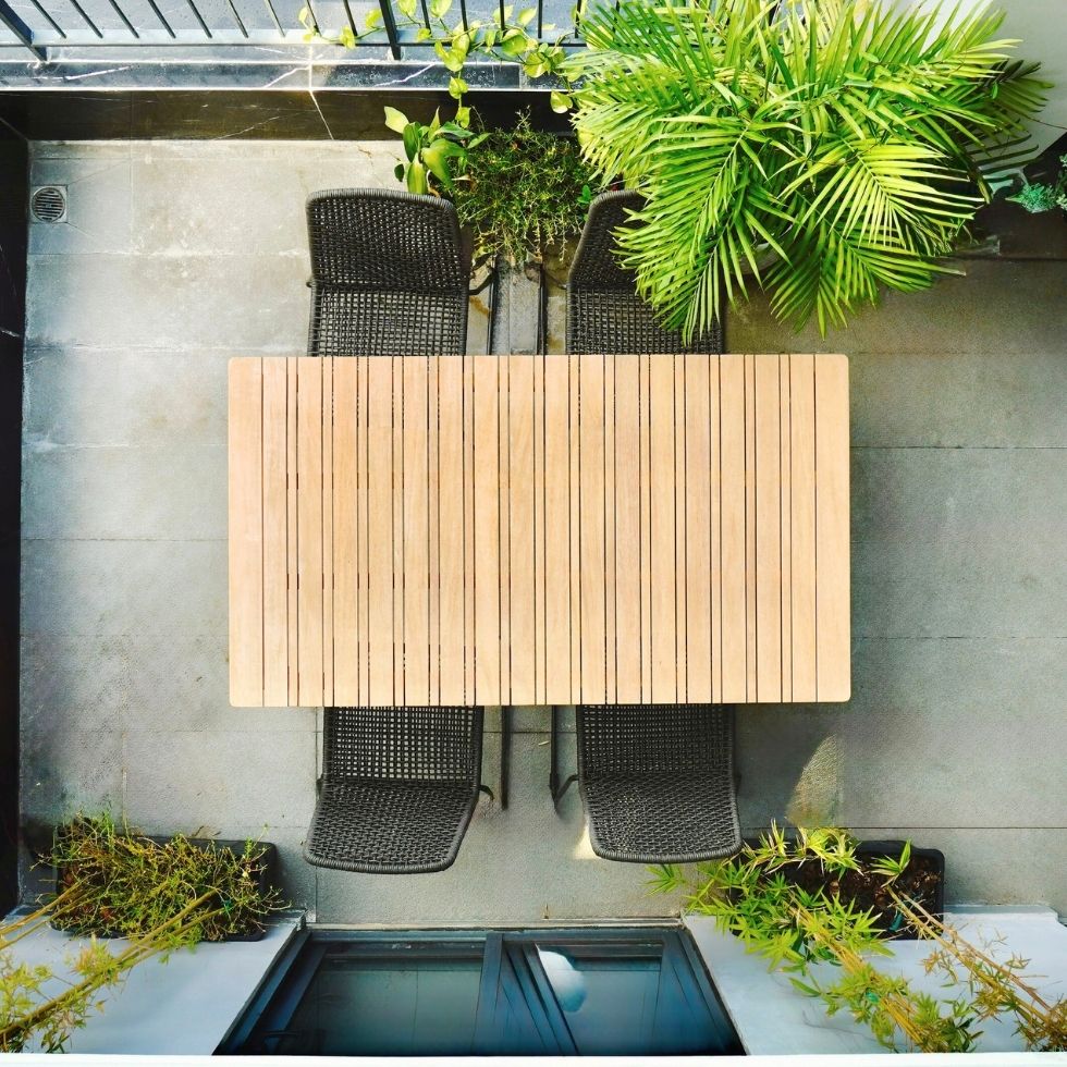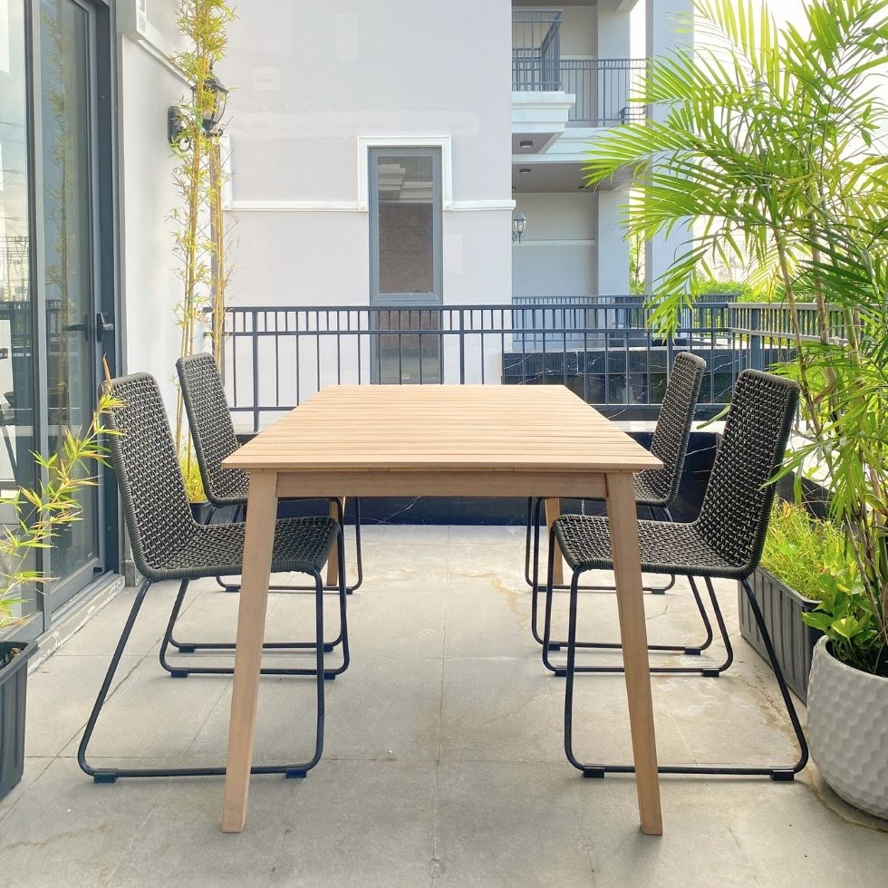 • Mặt bàn làm từ gỗ keo nhập khẩu cao cấp, sơn PU ngoài trời bảo vệ mặt gỗ