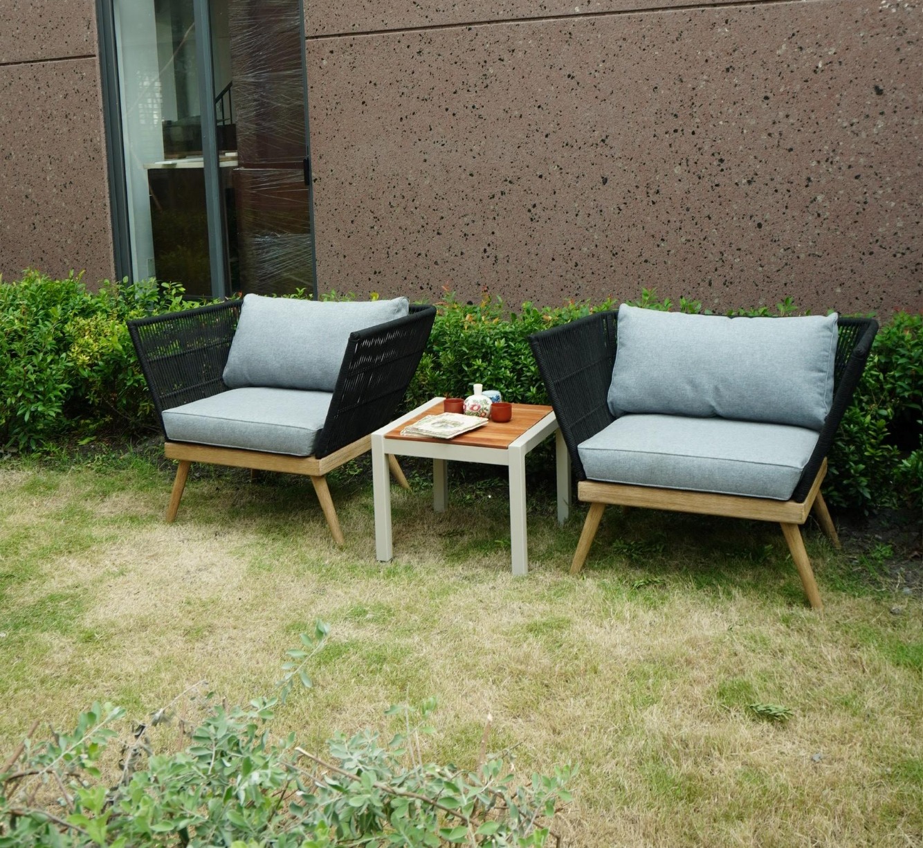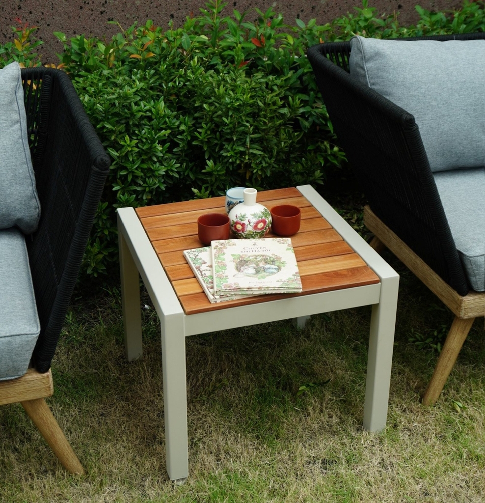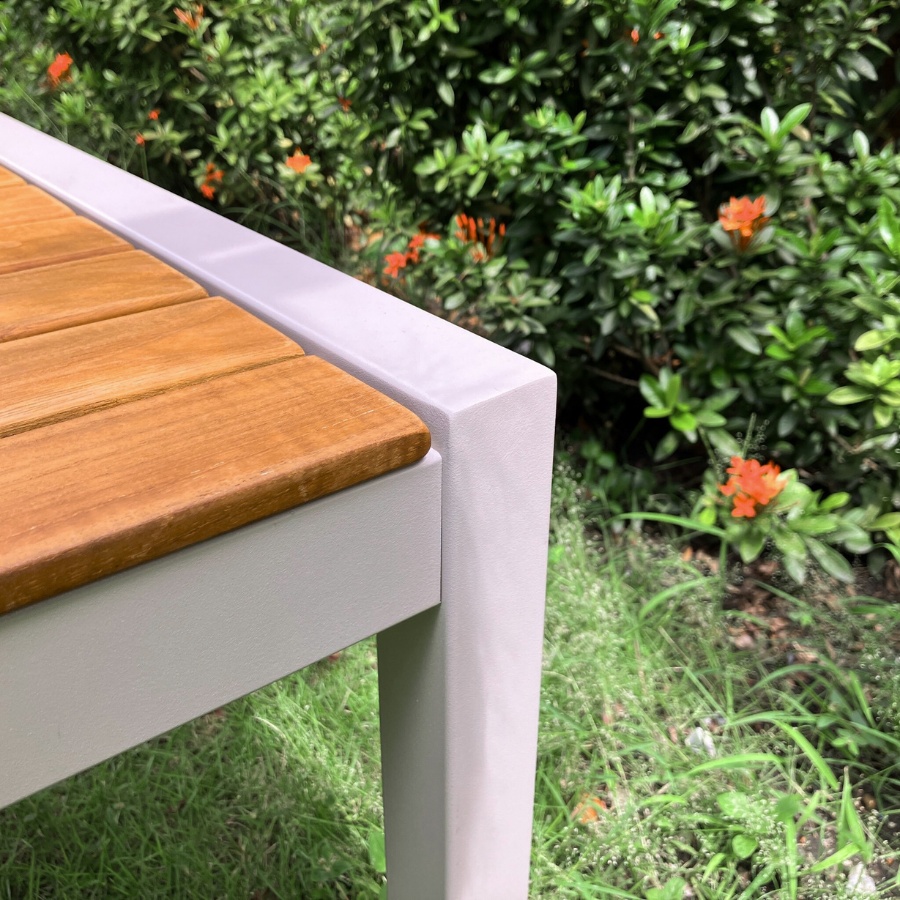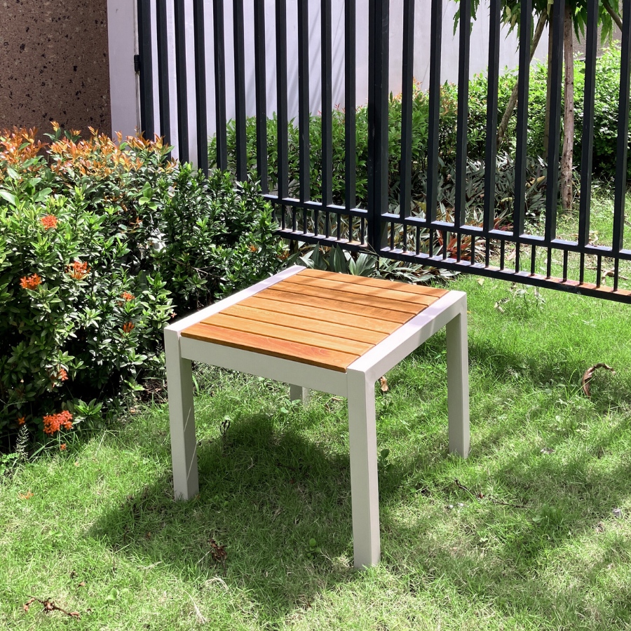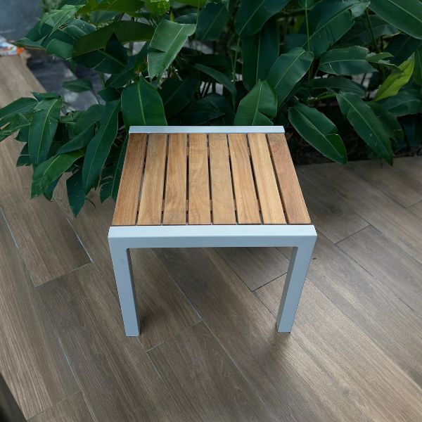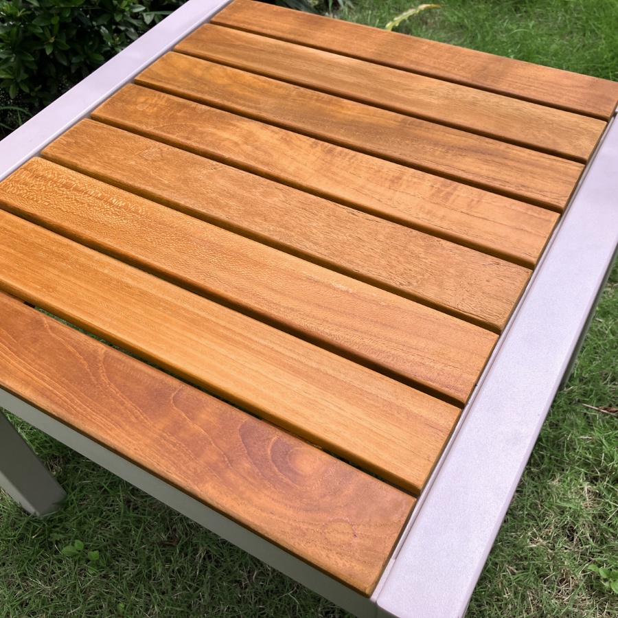 Bàn cafe sân vườn mặt gỗ sở hữu thiết kế vuông vắn, tối giản nhưng vô cùng tinh tế, phù hợp với nhiều phong cách nội thất sân vườn. Sự kết hợp giữa mặt bàn làm từ gỗ nhựa composite (WPC) và khung nhôm sơn tĩnh điện không chỉ tăng thêm độ bền mà còn mang lại vẻ đẹp hiện đại, sang trọng.