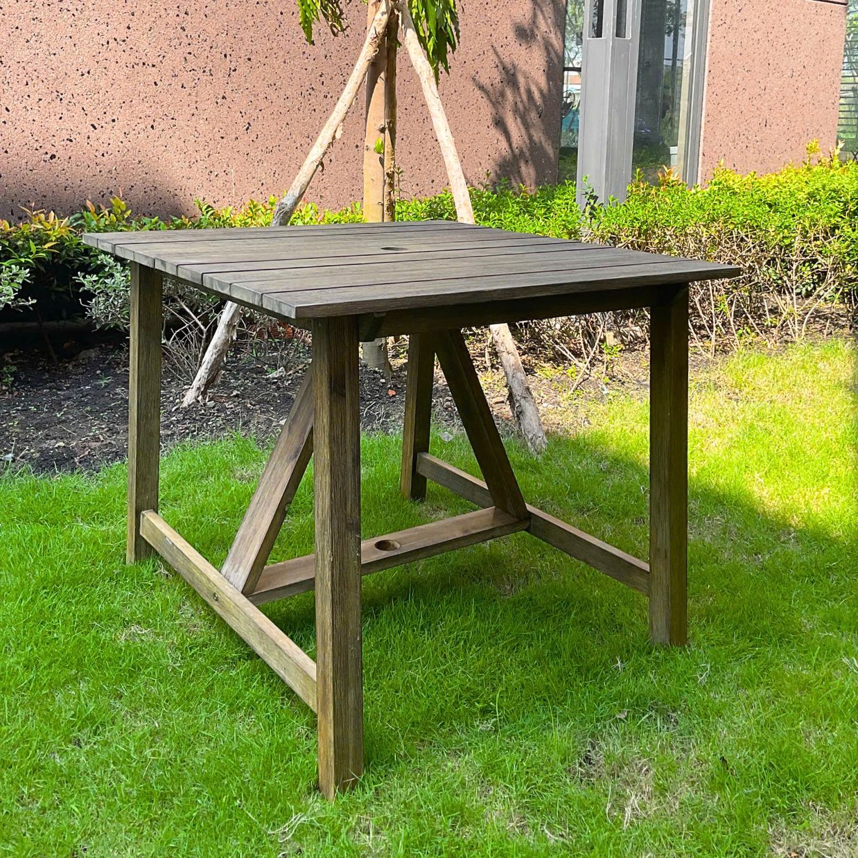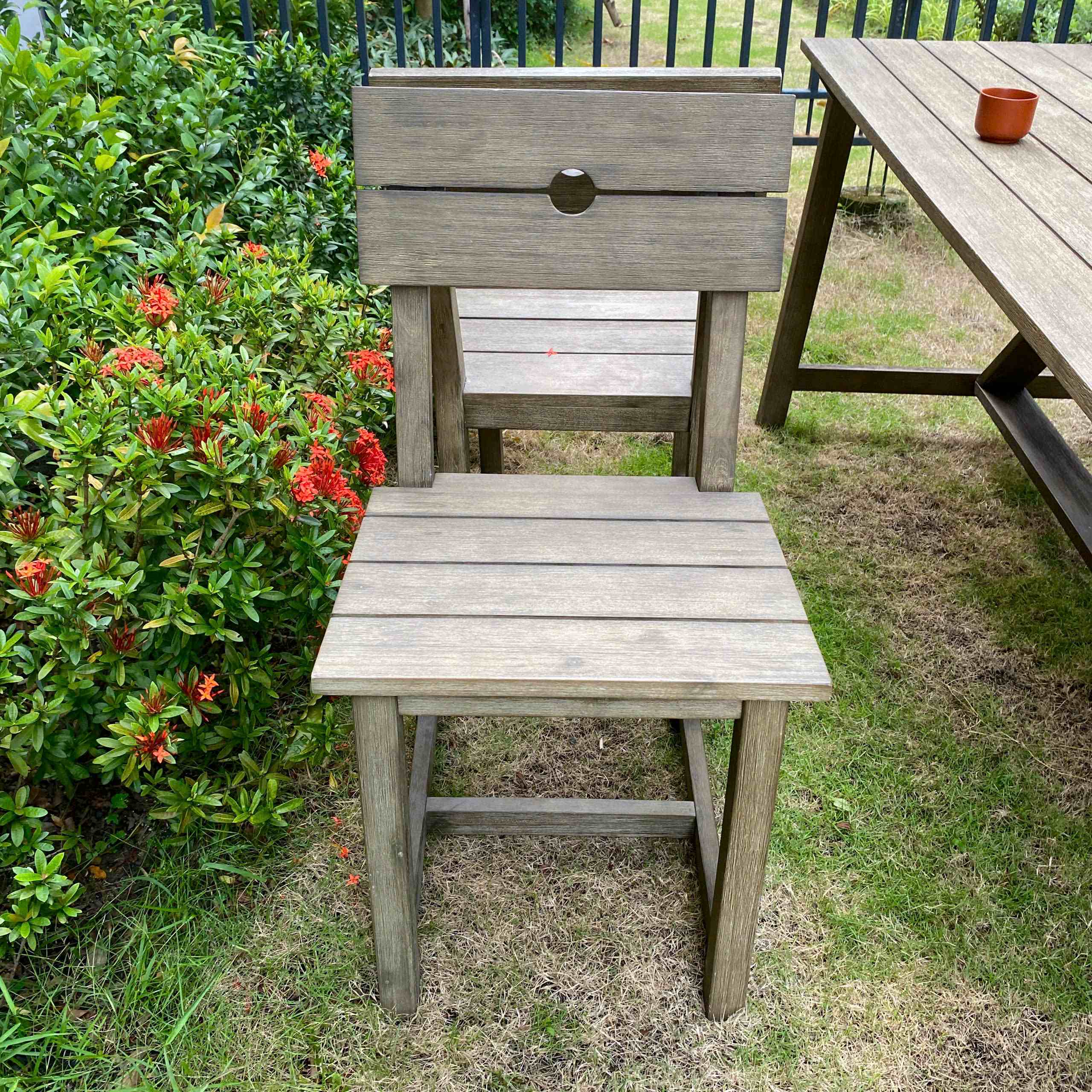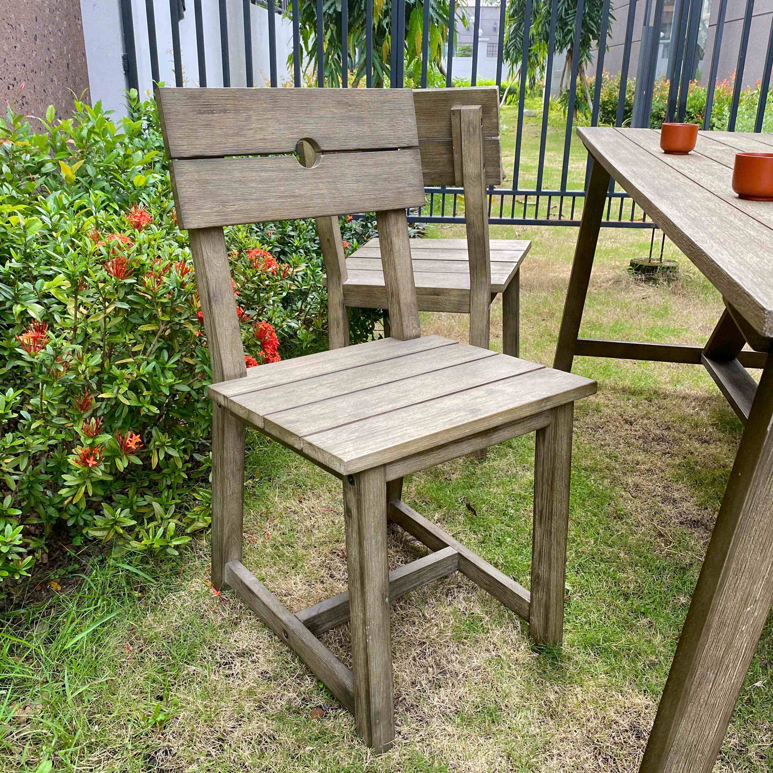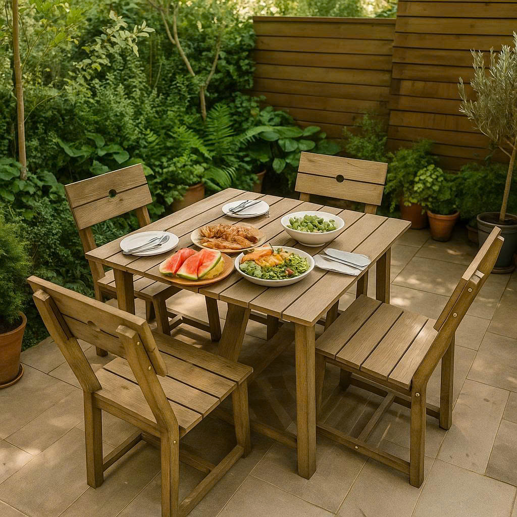 Cả bàn và ghế đều được làm từ gỗ bạch đàn đỏ Nam Phi 100%, nổi tiếng với độ bền và khả năng chống chịu tốt. Bề mặt gỗ được phủ lớp sơn PU ngoài trời giúp bảo vệ sản phẩm khỏi độ ẩm và các tác động từ môi trường, giữ màu sắc tươi mới và kéo dài tuổi thọ của gỗ.