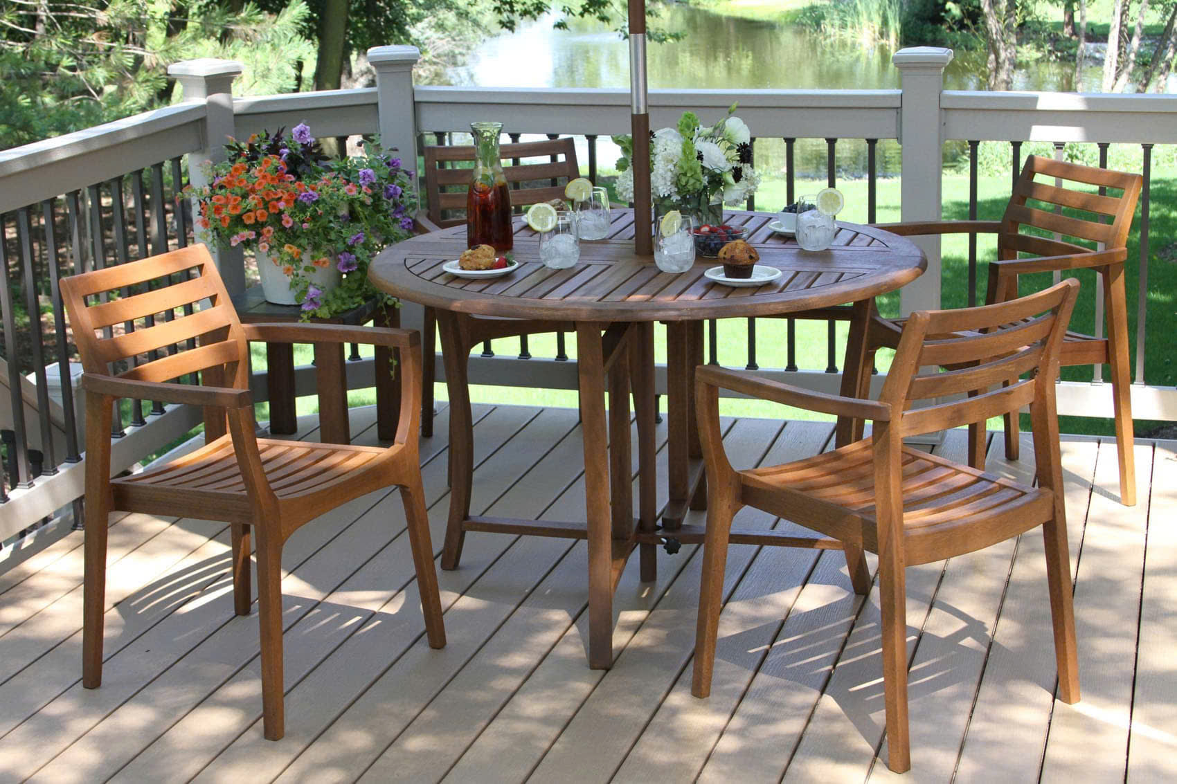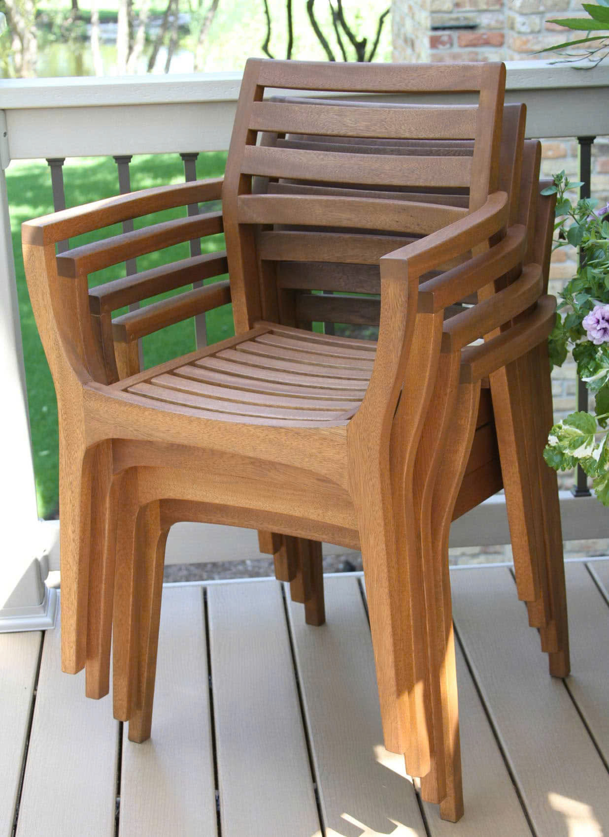 Gỗ teak và gỗ bạch đàn cùng lớp sơn PU giúp sản phẩm chống lại tác động của thời tiết, đảm bảo tuổi thọ cao.