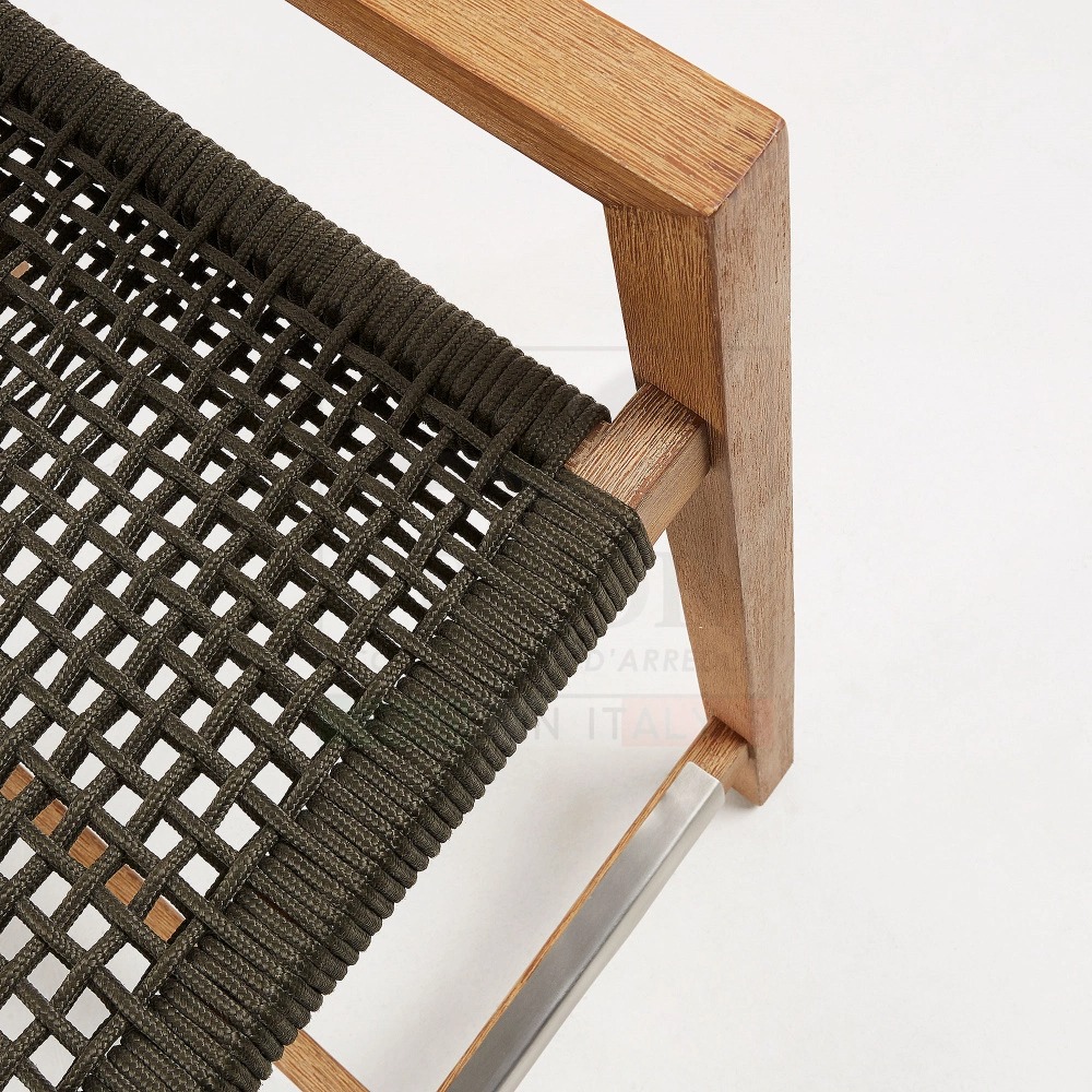 Chất liệu: Ghế được chế tác từ gỗ bạch đàn chắc chắn, kết hợp với phần ngồi làm từ dây dù polyester ổn định tia UV, đảm bảo sự bền bỉ và thoải mái khi sử dụng trong thời gian dài. Đặc biệt, ghế có lớp phủ 4 lớp PU để bảo vệ khỏi tia UV, tăng độ bền cho sản phẩm khi tiếp xúc với ánh nắng.