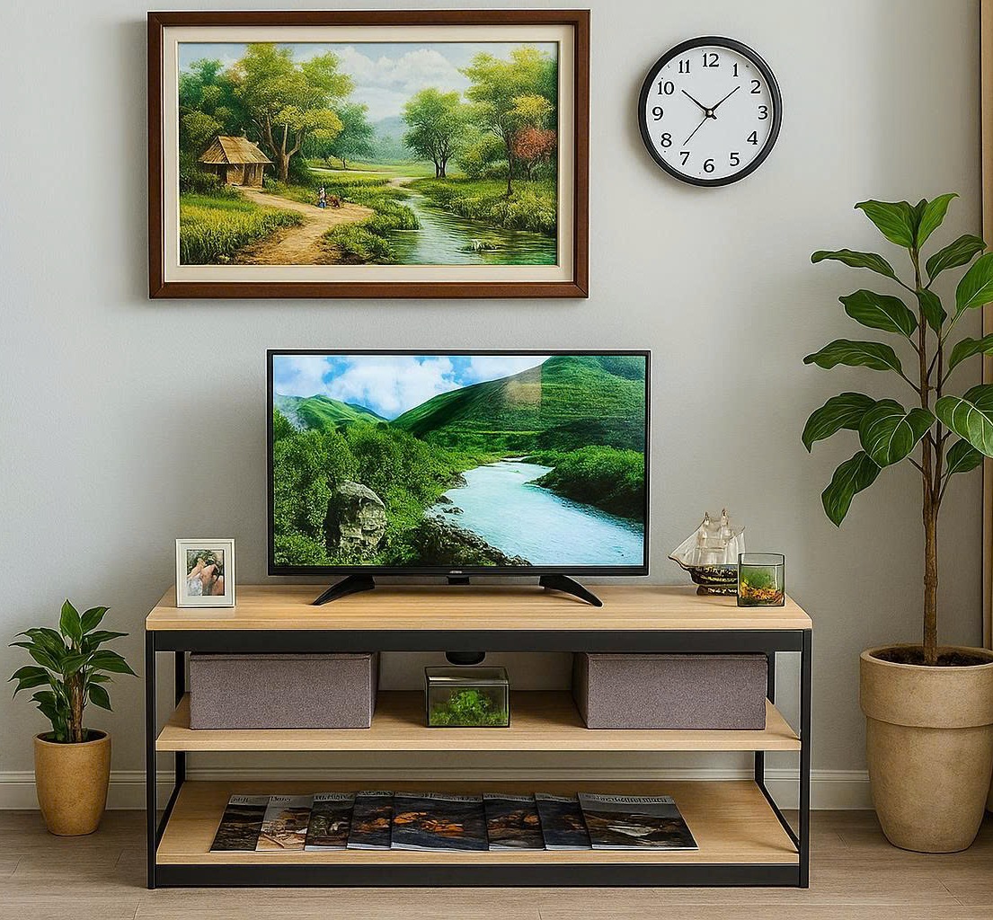 - Khung kệ: Kim loại sơn tĩnh điện chắc chắn, đảm bảo độ ổn định khi đặt tivi và các vật dụng khác.