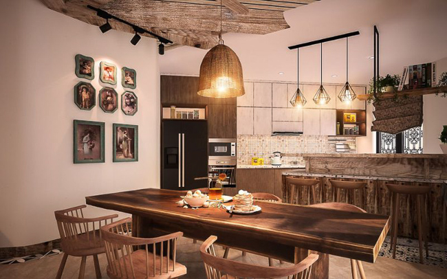Những chi tiết như kệ mở để trưng bày chén bát thủ công, đèn treo bằng sắt với kiểu dáng cổ điển, và những chiếc ghế đẩu bằng gỗ mộc mạc sẽ tạo nên một không gian bếp đầy quyến rũ và ấm áp.