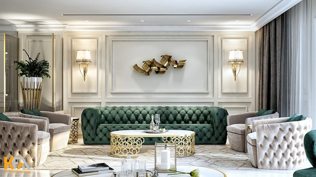 Các gam màu trung tính như trắng, kem, be thường được sử dụng cho tường và sàn nhà, kết hợp với các chi tiết trang trí mạ vàng, bạc để tạo điểm nhấn. Đèn chùm pha lê, thảm trải sàn hoa văn, và các bức tranh nghệ thuật cổ điển cũng là những yếu tố không thể thiếu trong phòng khách tân cổ điển.